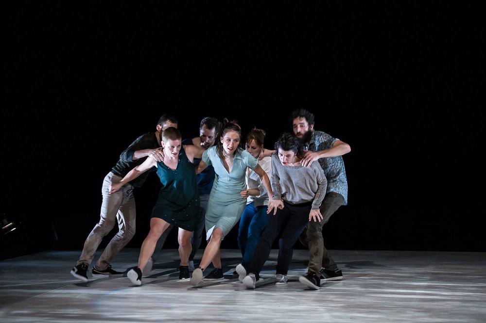 Dans une partition musicale saisissante, mêlant sonorités tribales et électro, les sept danseurs entrent peu à peu dans un rituel de transe, une course folle aux mouvements brefs, rythmés et hypnotisant. Ils sont pris dans un tourbillon d’une rapidité époustouflante, les danseurs reliés par une pulsation commune, dirigent l’énergie en harmonie. Unis puis électrons libres, leurs corps s’assemblent puis s’éparpillent, le groupe se disloque pour mieux se recomposer. Échappées individuelles, merveilles d’accident et de dérapage, puis les liens se resserrent pour reformer cette communauté.