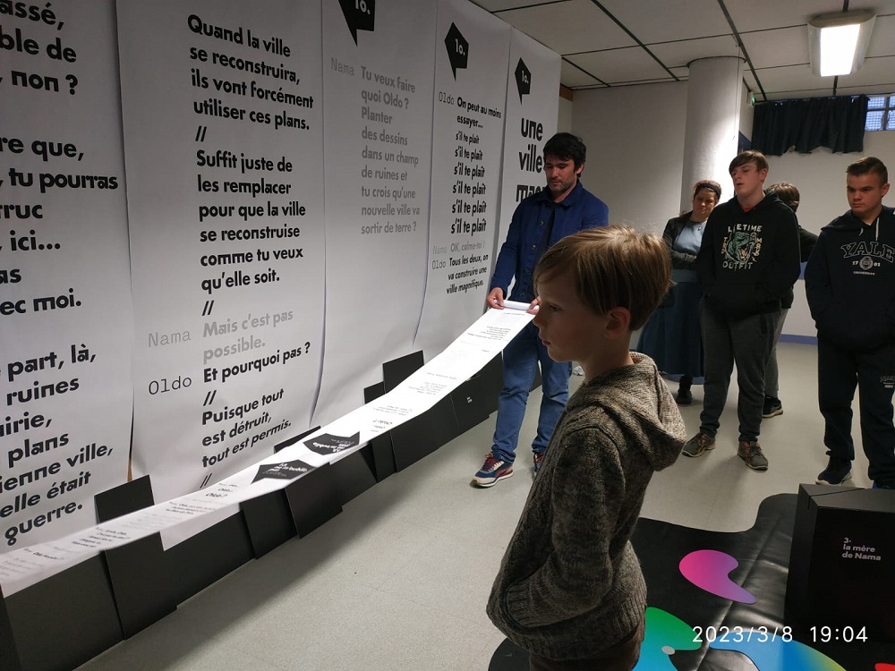La classe était répartie en deux groupes : un des groupe démarrait par le parcours KiLLT pendant que l’autre groupe participait à un atelier théâtre et lecture à haute voix. Ce groupe assistait ensuite au KiLLT pendant que les autres élèves participaient à une discussion philo, faisaient un retour sur le spectacle avec le/la comédien.ne.